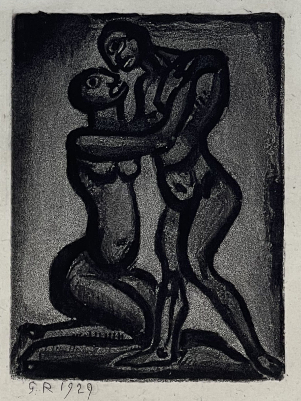 In this etching and aquatint, titled Les Amis, a young black woman kneels before a standing black male in a kind of embrace, but with expressions that do not reflect love. This edition was published by Vollard for the Société Normande des Amis du Livre, Paris, in 1955.