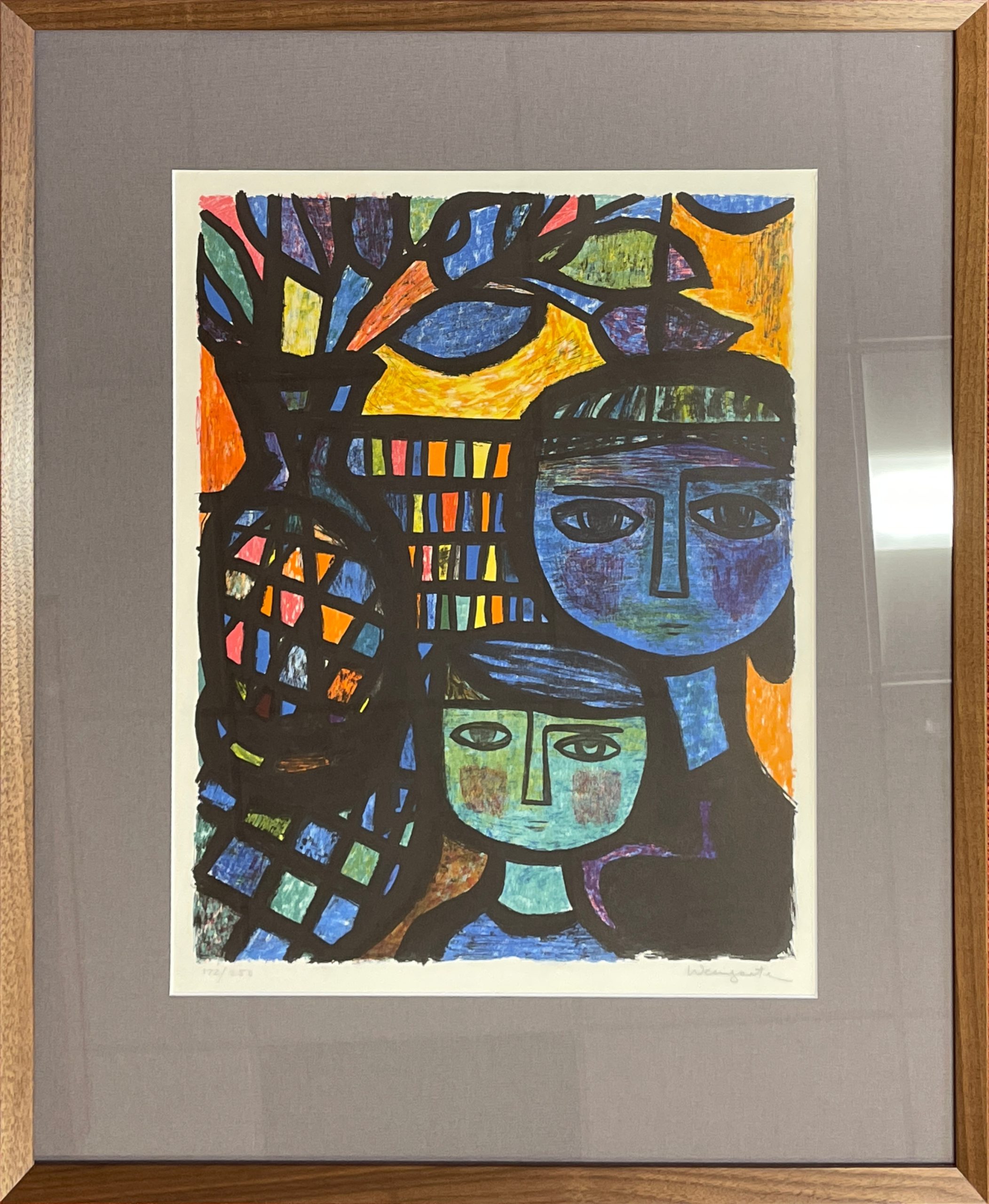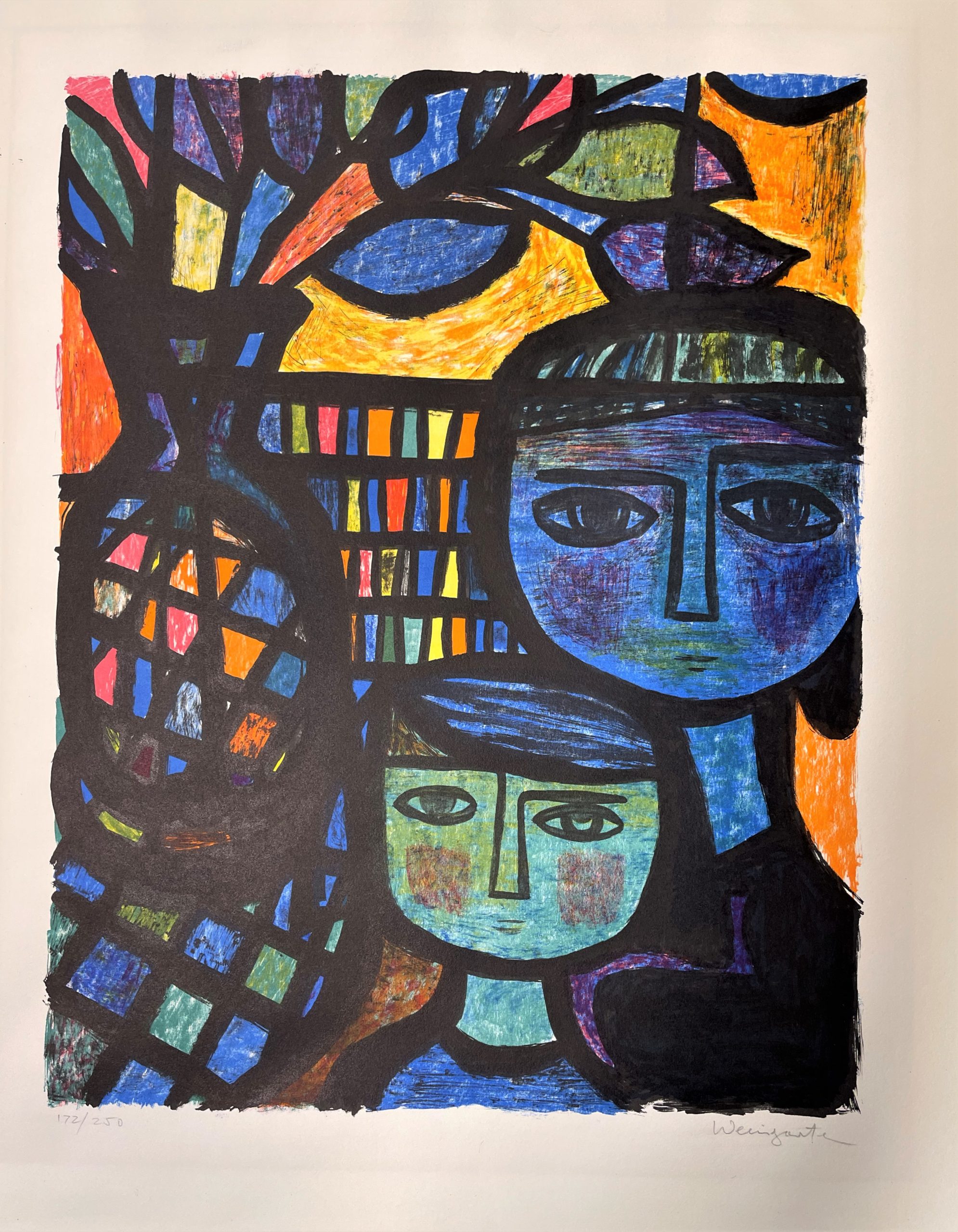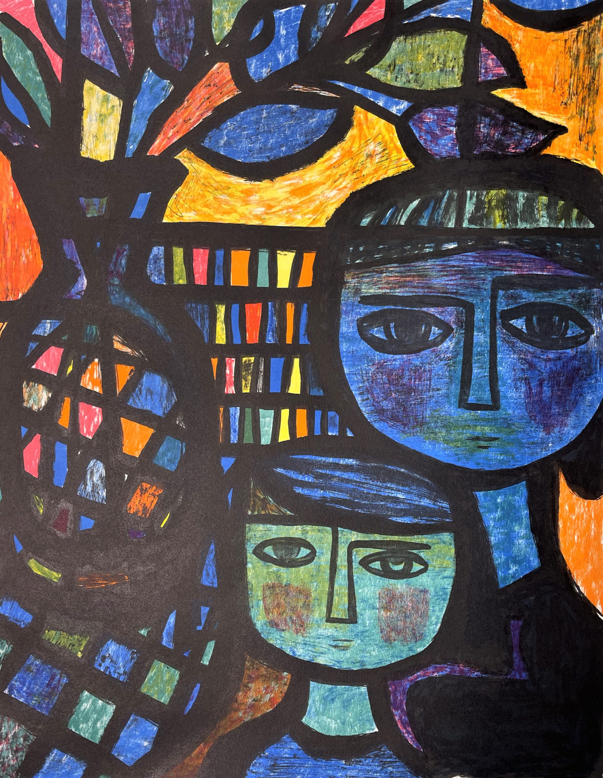 Hilde Weingarten has created a portrait of a woman in a girl in a Fauvist palette, using an interesting mix of geometrical and organic shapes, standing in front of what appears to be stained glass. Weingarten’s use of bold black lines resembles Georges Rouault’s famous stained-glass-inspired works.