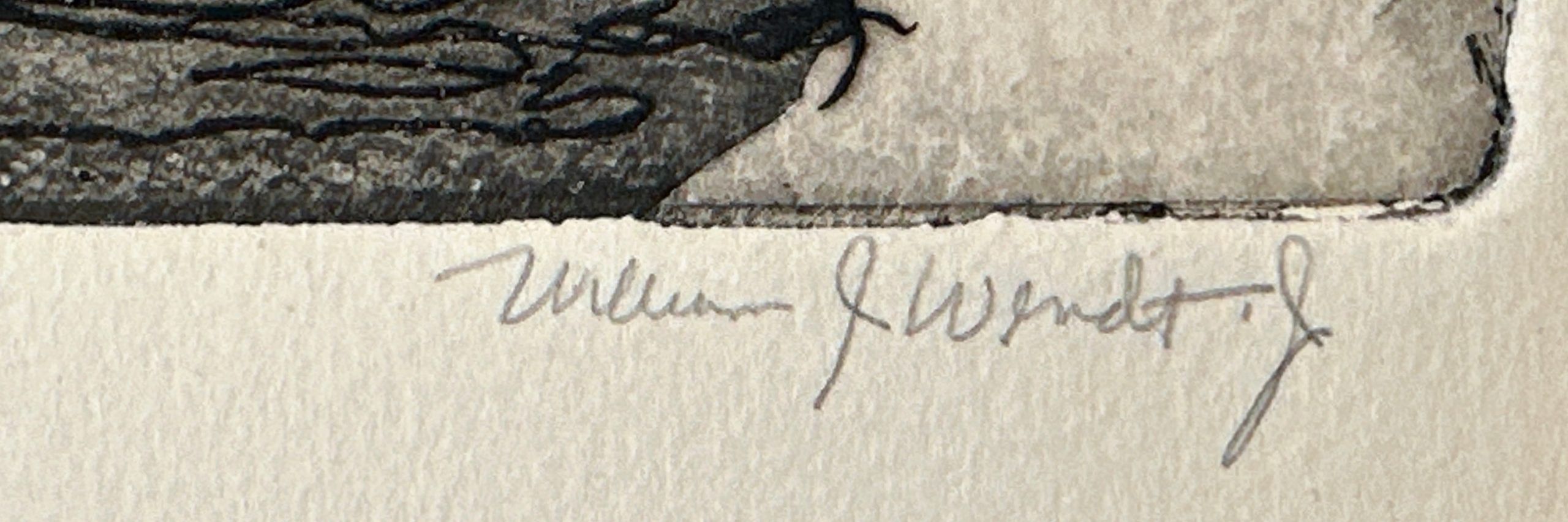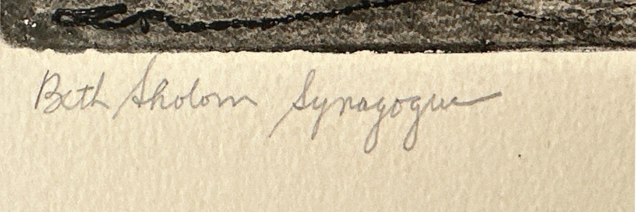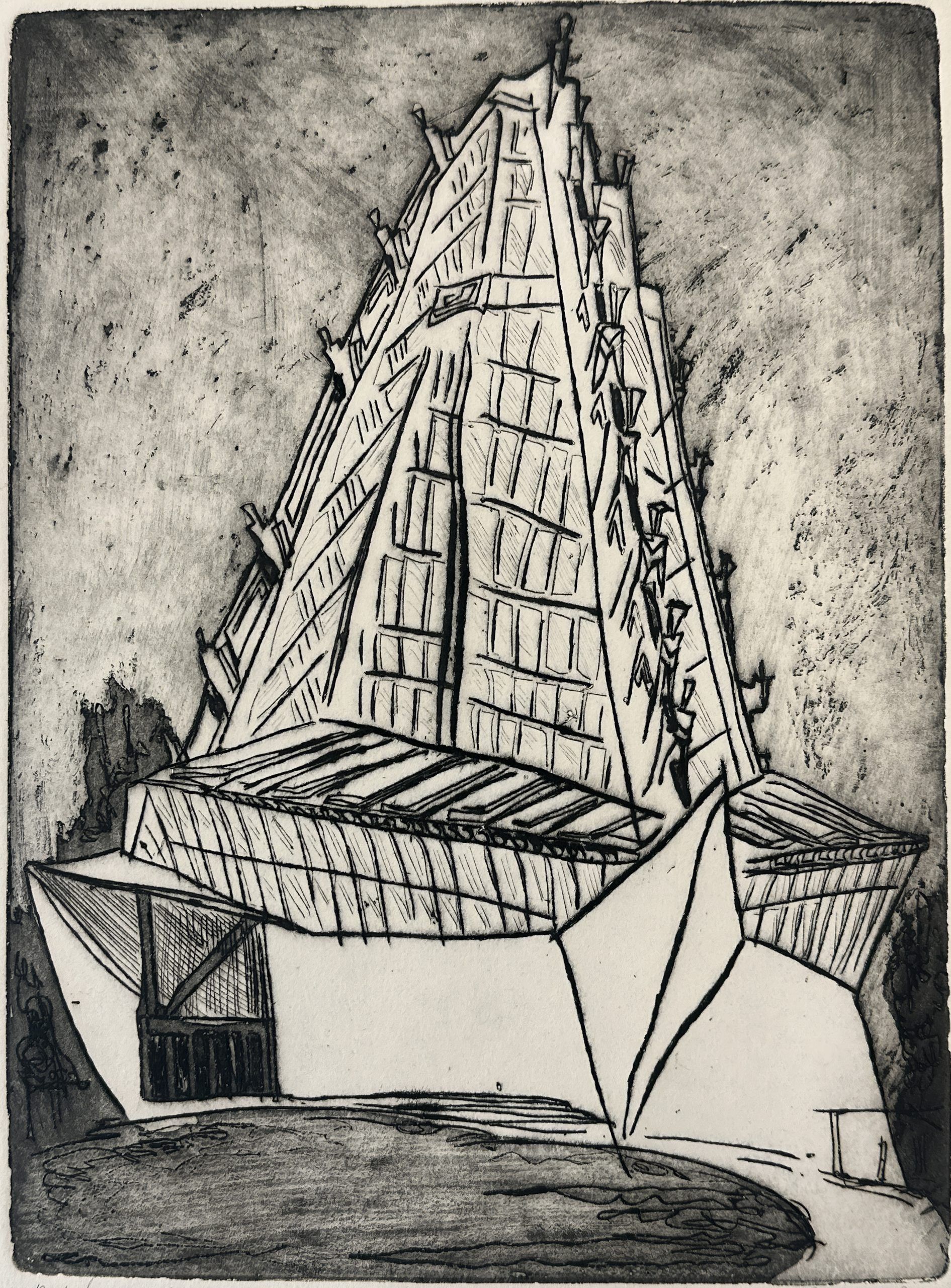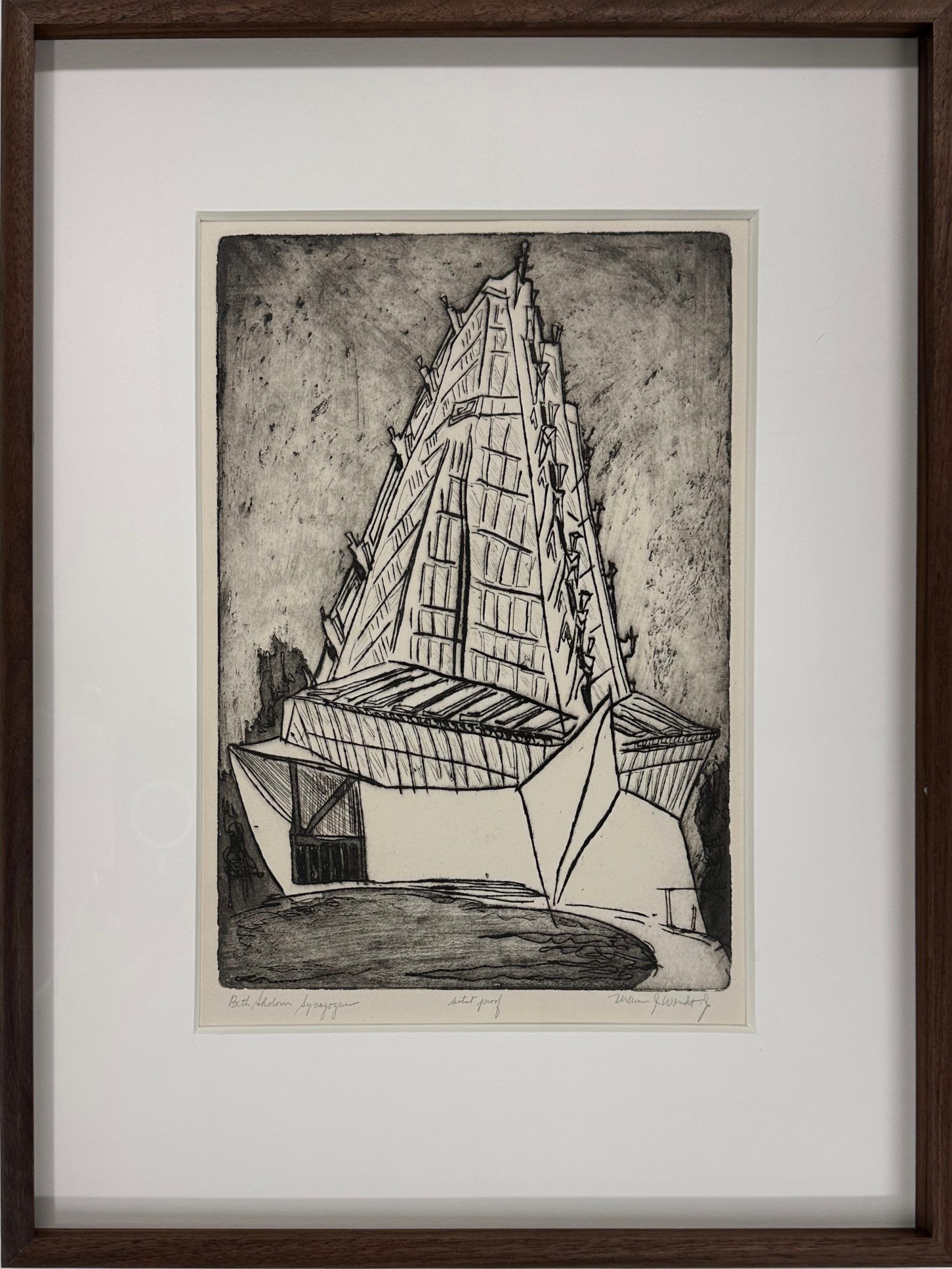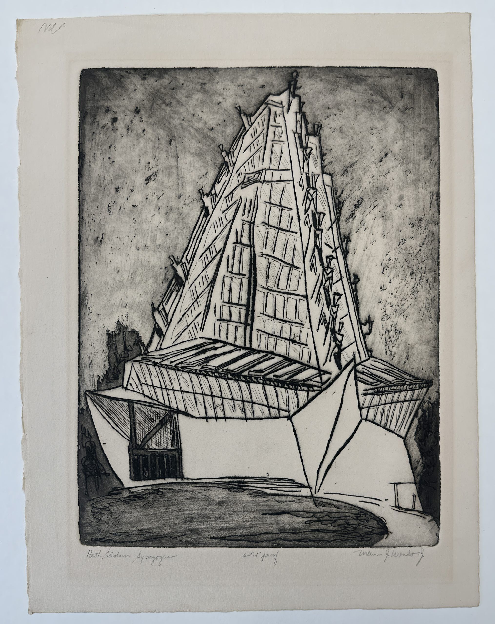 An etching and engraving of Frank Lloyd Wright’s monumental Beth Sholom Synagogue, which the American Institute of Architects and the National Trust for Historic Preservation designated as one of the seventeen Wright buildings most worthy of preservation. Commissioned in 1953 and completed in 1959 for the Beth Sholom congregation in Elkins Park, Pennsylvania, it is a masterpiece and a superb example of Wright’s lifelong engagement with the diagonal. The dark lines and proportions project the power of the architecture.