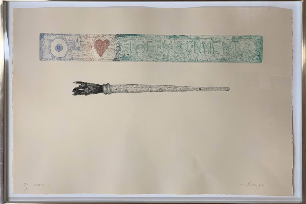 William T. Wiley’s plea to environmentalism, depicting two totemic items: a stave and a torch-like wand, both heavily enriched with the written word, a heart, and an eye. Since the mid-1960s Wiley has laid bare the lies and deceptions behind environmental catastrophes and other issues of the world.