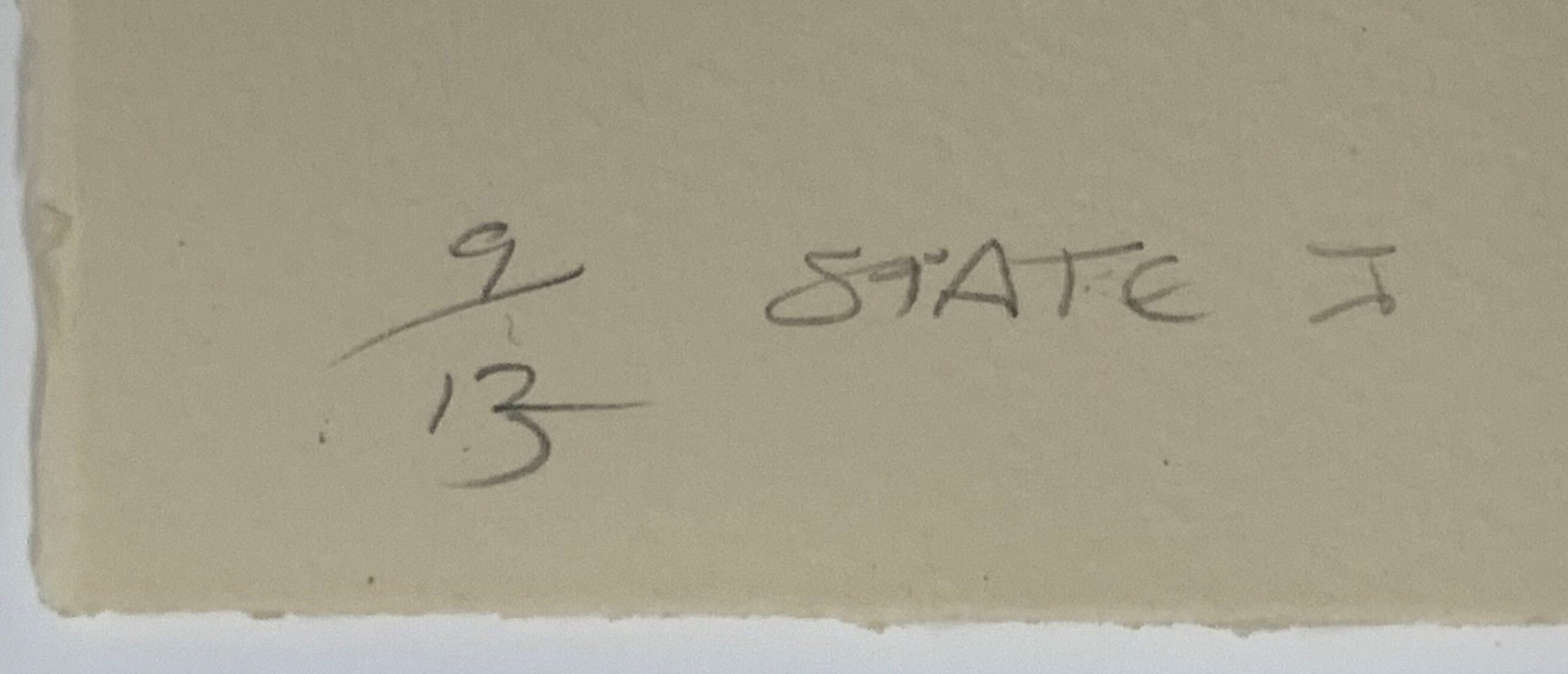 Signed by the artist in pencil, en recto lower right with date (“86”). Editioned, in pencil, en recto lower left. Bearing the Teaberry Press blind stamp en recto lower right