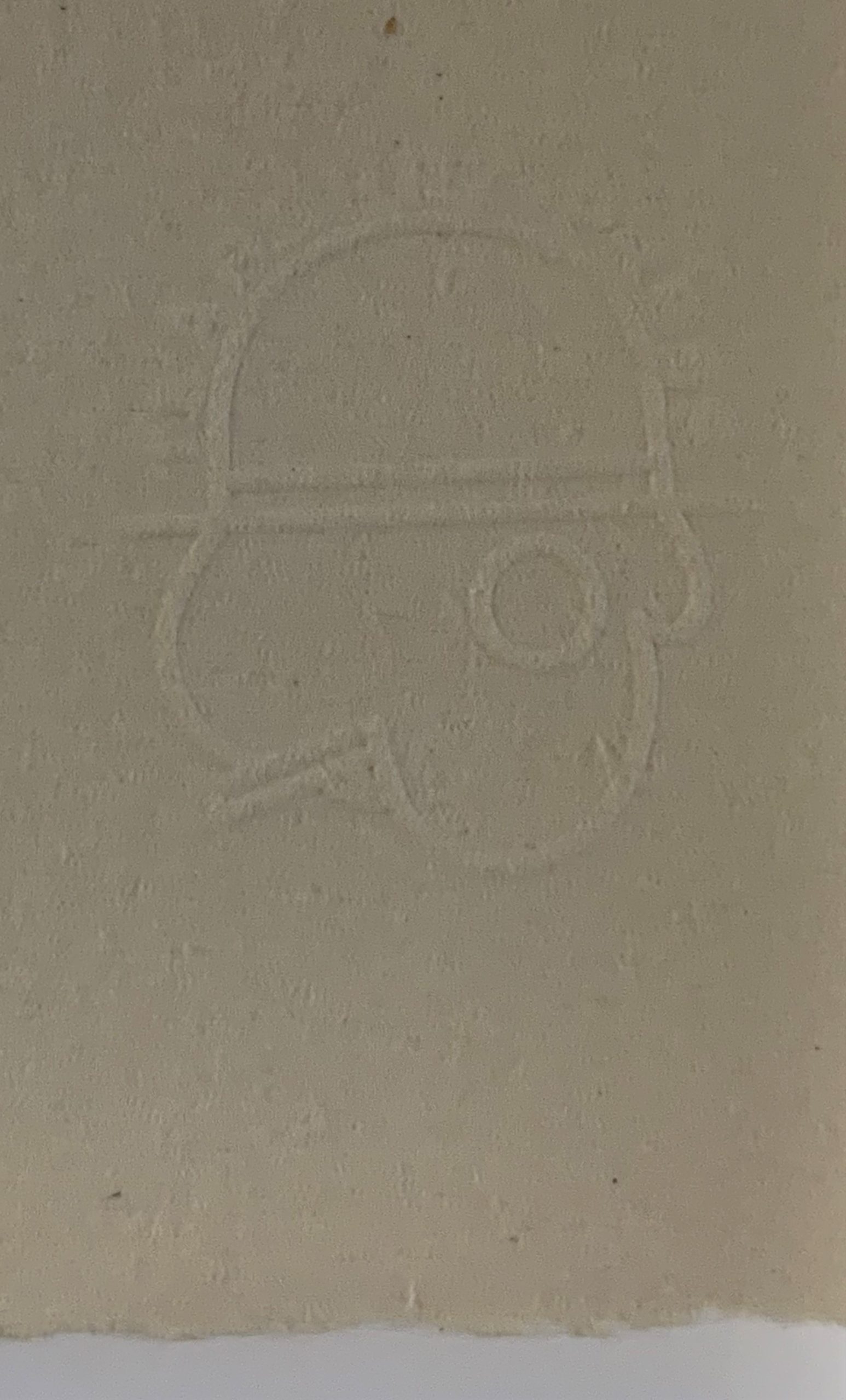 This is a deeply impressed intaglio print, restrained to the top half of a field of beautiful Arches paper.