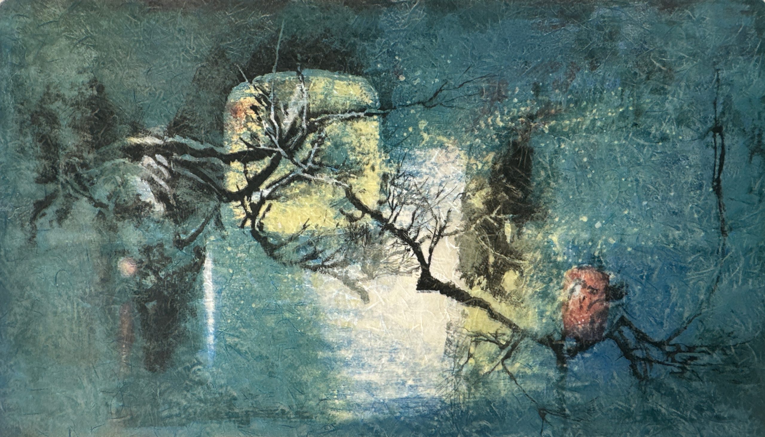 An exquisite lithograph of a tree branch in the dark days of winter but with a bird and light suggesting life despite the winter, executed in a painterly manner and printed on a double layer of paper; the top Japan and the bottom Arches, creating depth and a beauty which the photographs cannot capture. Professionally framed, using strictly conservation-grade materials, in a wood frame with a silk-covered mat and a delicate fillet behind 99% UV-blocking art glass.